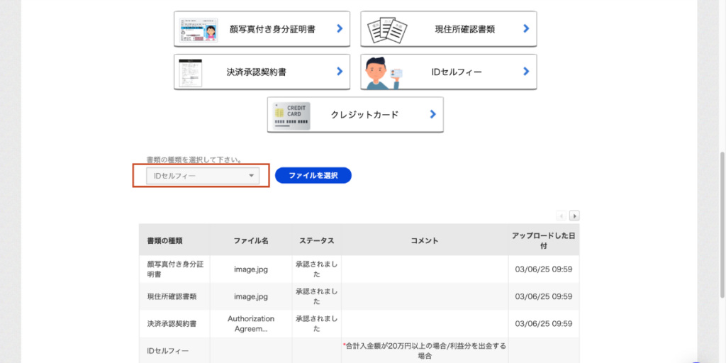下の方にスクロールして、書類の種類を選択してくださいという欄にて「IDセルフィー」を選択します。