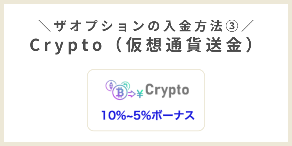 Cryptoとは仮想通貨を利用したザオプションへの入金方法で、現在キャッシュバックキャンペーンを行っているため、少しでもお得に始めたいなら仮想通貨入金がおすすめ!