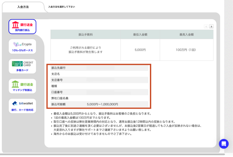 銀行送金 (国内銀行振込) | 5,000円〜 | 無料 (銀行送金手数料のみ必要) | 平日:営業時間12時間以内 土日:翌営業時 | 振込先は都度変更 | 1,000,000円 |