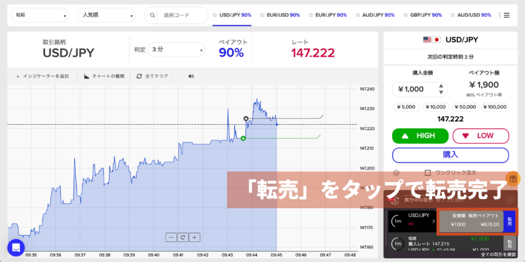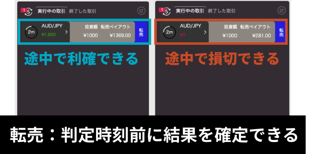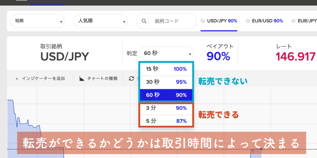 - 3分・5分・15分などの取引:転売可能。取引画面に「転売」ボタンが表示され、リアルタイムでペイアウト金額が変動するため、タイミングを見てクリックすれば即時決済できます。