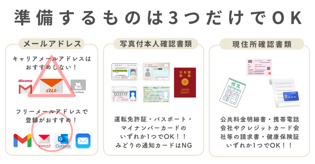 ザオプションの口座開設に必要なものは「メールアドレス・写真付き本人確認書類・現住所確認書類」の3つ。